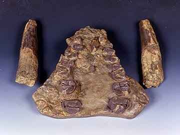 新生代はじめに出現した様々な種類の哺乳類のうち、絶滅した種類の上あごと牙です。