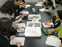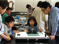 偏光板や顕微鏡などを使って、「石」のつくりや特徴を調べます。