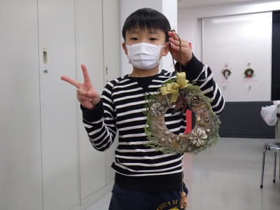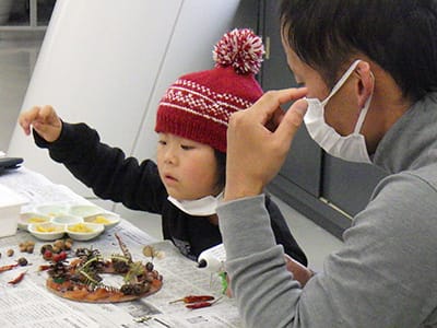 - ドングリや松ぼっくり、マカロニなど好きな材料をつかってクリスマスリースを作ります。最後に恐竜のフィギアをのせて、世界で1つのオリジナルリースの完成です!!