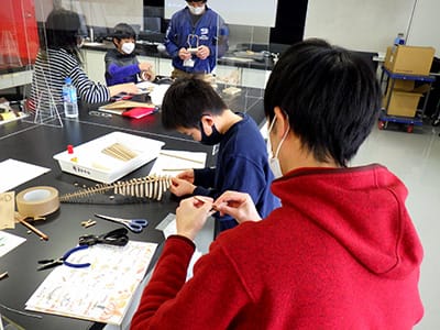 - 恐竜の骨の動きを想像し、親子で協力して、今にも動き出しそうな恐竜骨格を作ろう。