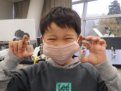 - ルーペやけんびきょうをつかって、砂のちがいをかんさつします。おきにいりの砂をみつけたら、恐竜のモチーフがはいったマイ砂の小びんをつくりましょう。恐竜じだいの砂つぶもあるかも⁉