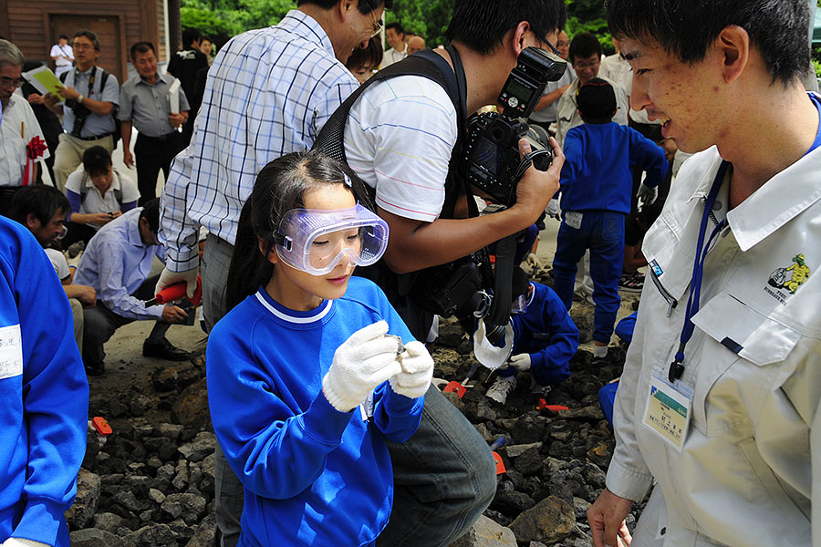 オープニングセレモニーでは来賓による祝辞とテープカットのあと、実際のツアーと同様にまず展示場で発掘の歴史や実際の発掘標本をご覧いただきます。次に観察広場に下りて現場の崖と発掘について研究員が解説しました。あとは体験広場での化石発掘体験です。今日は勝山市立村岡小学校と大野市立下庄小学校の皆さんに来ていただいて体験していただきました。研究スタッフの指導で叩きはじめると、すぐにあちこちで歓声が上がり、スタッフに発見の報告をしていました。