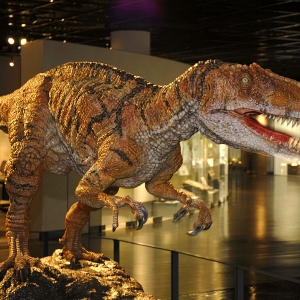 獰猛な顔立ちに赤く広げられる大きな口やウロコ状の皮膚、筋肉の付き方などは、野生の肉食獣をまさにイメージさせます。コンピュータ制御の圧縮空気によってその体はスピーディーかつダイナミックに動き、威嚇や咆哮などの動作をよりリアルなものにしています。
