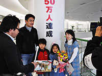 記念すべきそのお客様は、三重県津市の対馬晋渡くん(9歳)、木乃香ちゃん(7歳)とそのご家族です。当館から記念の花束と、恐竜プラモデルやイグーのぬいぐるみが贈呈され、みなさんとても喜んでおられました。