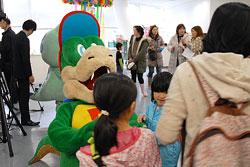 70万人を突破した3月29日㈯の翌30日には記念セレモニーを行い、「恐竜エキスポふくい2000」の際のマスコット「フクリュウくん」、「横浜生まれのフクイラプトルくん」および「Juratic」王国の「ラプトくん」の3体の恐竜キャラクターたちがお祝いしてくれました。そのあと「70」にちなんだプレゼント(「地元奥越の桜の切り枝」や「勝山恐竜水」など)をご来館の皆様にお配りしました。
