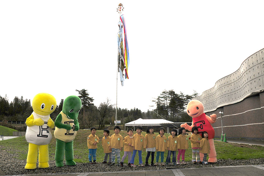 今年は勝山市の野向保育園の11人の園児の皆さんにお手伝いしてもらいました。まず、恐竜博物館正面玄関前で恐竜こいのぼりを揚げてこいのぼりの歌を発表してもらったあと、五月人形の除幕と踊りの披露をしてもらいました。