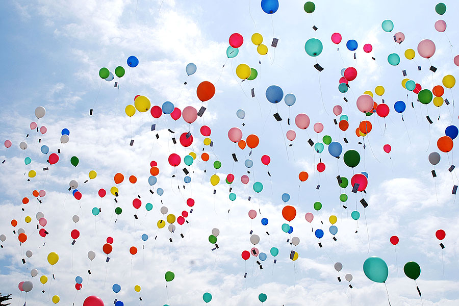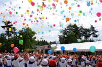 さらに、全員で、7月10日㈮に開幕する、恐竜博物館開館15周年記念特別展「南アジアの恐竜時代」の招待券を付けた風船を全国に向けて天高く飛ばしました。招待券を拾われた方は、この夏、是非特別展にお越しください。