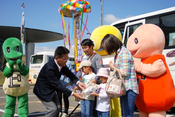 10時出発便参加者の小学生以下の皆さんには、当館オリジナルグッズセットと恐竜文具セットを、グループごとに恐竜博物博物館展示解説書1冊と当館オリジナルのサウンド付きポップアップカード1枚をプレゼントしました。