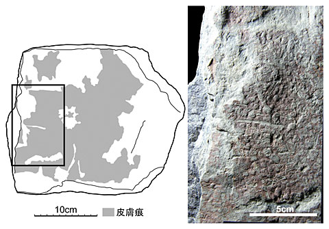 皮膚痕化石が残されている岩石は幅約23cm、長さ約24cm、高さ約7cmの大きさの細粒砂岩で、皮膚痕はその表面の約60%に保存されている。皮膚痕化石は、径約3~5mmの多角形ないしほぼ円形状の突起(鱗の痕)が多数集ったものである。岩石の構造を調べた結果、湿った地面に恐竜が皮膚の痕をつけ、細かい砂がそのくぼみを覆い、最終的にその型が化石として保存されたと考えられる。なお、今回の皮膚痕は恐竜の足の裏の皮膚痕ではなく、恐らく体を広く覆う皮膚からのものと思われる。これまで報告されている恐竜の皮膚痕化石との比較では、ハドロサウルス類(植物食恐竜)であるエドモントサウルスやパラサウロロフスの四肢に見られるものに類似するが、今回のものは骨の化石に伴って発見された皮膚痕化石ではないため、その詳しい種類の特定は困難と思われる。