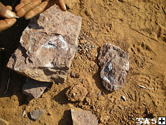 表面に現れた化石の中には保存の悪いものもあります。このような化石は、樹脂を使って固くして採集したいのですが、日本から送っている発掘資材が到着しません。日本の運送会社に電話何度も問い合わせているのですが、タイの税関の許可がでないなどの理由で今日も到着しません。一時間でも早く資材が到着することを願っています。