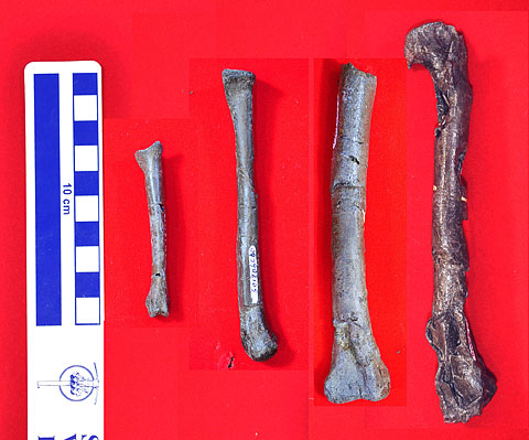 - 獣脚類:歯(3.5×0.7~3.3×1.8)、頸椎(3.3×3.3)、胴椎(2×3.4)、尾椎(3×2、4×1.7)、指骨(7×1.7)、大腿骨(15.3×1.5)、脛骨(3.3×1.5、12.5×2.7)、中足骨11.5×0.5)、末節骨(4.1×1.5)