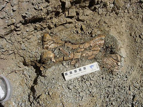 - オルニトミモサウルス類(獣脚類)と考えられるまとまった化石:関節した尾椎を含む数多くの脊椎骨、血道弓、指骨など