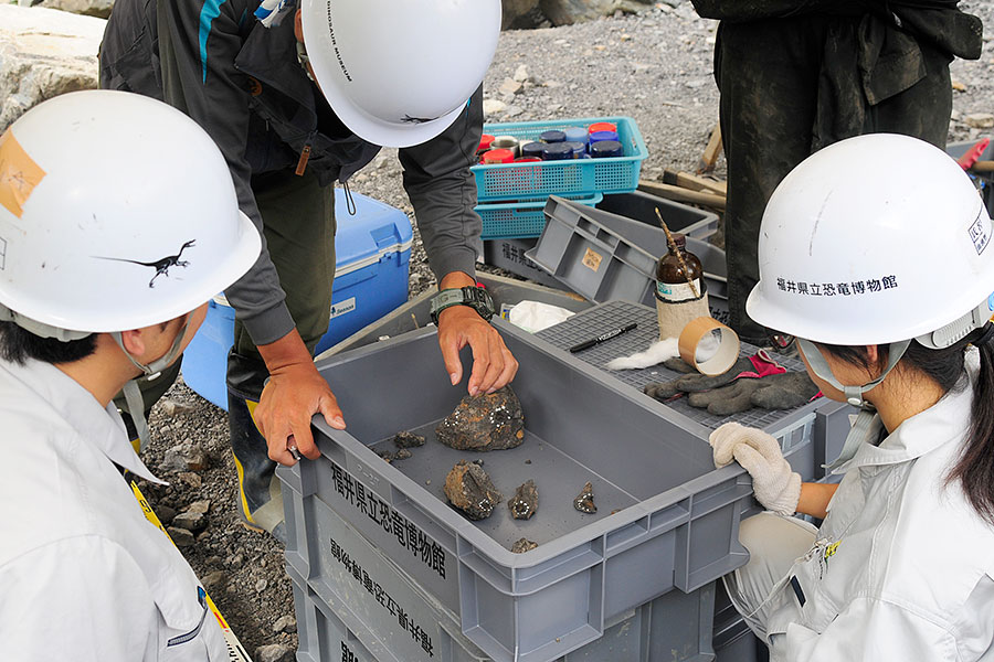 午後になって野外恐竜博物館の補助員さんが現場の見学に訪れました。夏休みが終わり9月に入って、さすがの大混雑は緩和されて、空き時間に見学に来られるようになったとのこと。野外と現場とでは同じ石を叩いているといっても割る量が段違いです。当然、出てくる化石の数も段違いです。自身の観察眼を鍛えるために、また地学専攻の学生として、発見されたばかりの化石を観察したり、研究員の説明を熱心に聞いたりしていました。