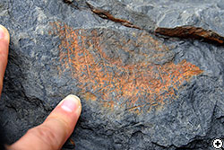 今日も前線の重機が動いていません。前線の足跡(仮)面はキレイに片付けが終わって、あとは撤収を残すのみのようです。調査員たちは違う層準の黒い頁岩層を割っていました。細かい泥岩質の岩で、うまく叩くと層理面にそって板状にキレイに割れてくれます。その面に植物などが残されていれば良好な標本となるのですが、なかなか化石が入っていないようですね。岩は薄い層が幾重にも重なっていて、そのどれかにはもしかして付いているのかも知れません。全ての層を剥がすことは不可能なので、割れれば化石の面で剥がれやすいという説を信じるしかないのでしょう。
