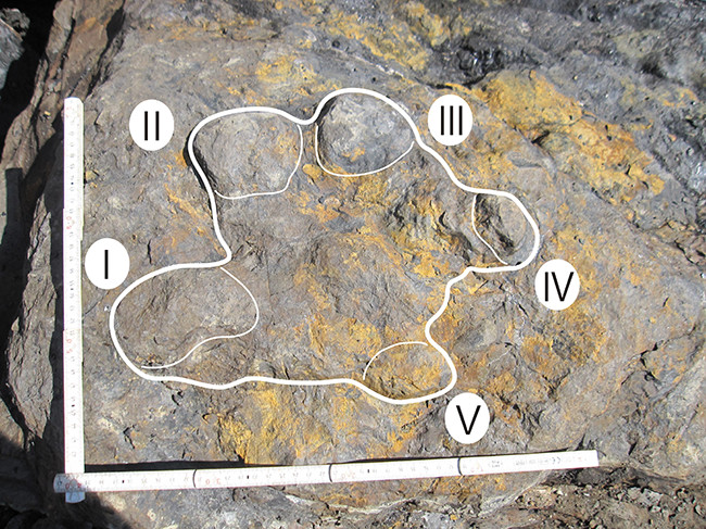 砂岩の表面に残された恐竜の足跡化石が発見されました。5つの丸い指の痕跡が半円状に配置するというアンキロサウルス類に見られる特徴的な前足が確認されました。(画像1・2)