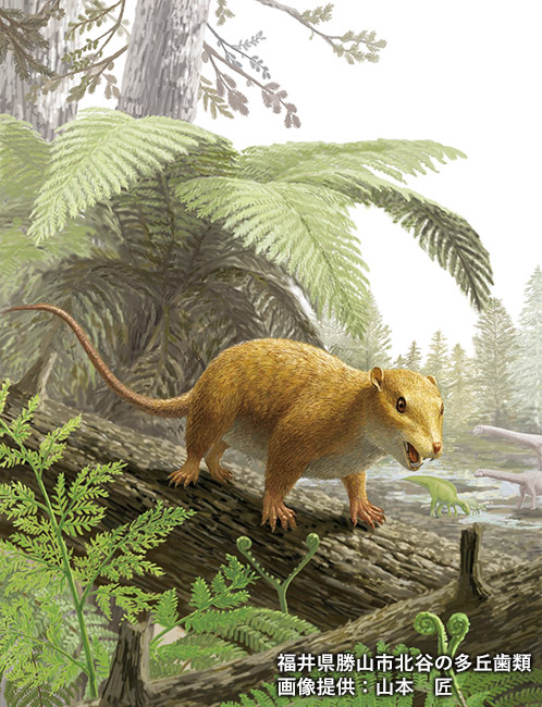多丘歯類の化石は、過去に石川県と福井県から歯や顎の化石が発見されています(下記参考2)。多丘歯類は恐竜時代に最も繁栄した哺乳類で、後期白亜紀の進歩的な種類については、既にいくつかの骨格が知られています。しかし、初期の多丘歯類の骨格化石はほとんど知られていません。2013年、非常に原始的な多丘歯類(ルゴソドン・エウラシアティクス)の骨格が、中国遼寧省の後期ジュラ紀(約1億6000万年前)の地層から報告され話題となりました。日本の化石は、ジュラ紀に続く前期白亜紀の多丘歯類の進化や多様性を解明する上で、欠かせないものとなります。