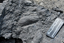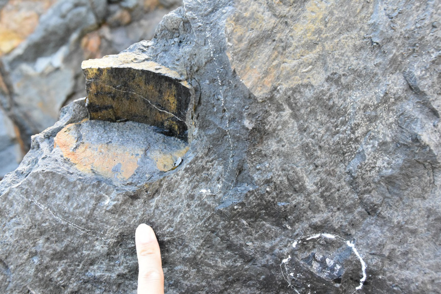 すごく立派な骨化石ですね!大岩から突き出ています。平らな板状ですが、すこし内側に反っていますね。まだまだ下に、しかも深く入っていそうなのでクリーニングが楽しみな骨ですね。発見した化石は薄めた樹脂を塗って表面を保護します。そうしておいて、該当部分を持ち帰るために多少なりとも岩を割って小さくします。しかしすぐそばに別の骨が付いていますので、割るのも苦労しそうです。無事博物館に持ち帰れるのでしょうか。