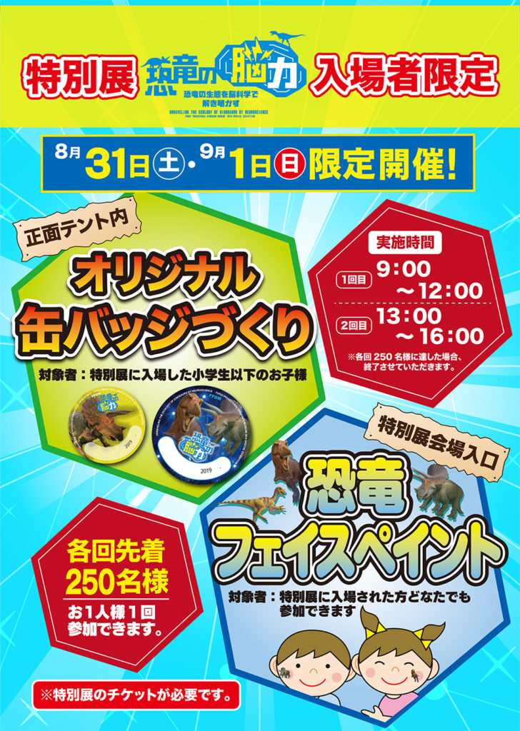 8月31日(土)、9月1日(日)の2日間、特別展限定イベント「オリジナル缶バッジづくり」と「恐竜フェイスペイント」を開催します!