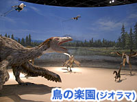 特別展の導入部です。恐竜から鳥へ進化のイメージを美しい羽毛恐竜や鳥のコラージュで演出します。